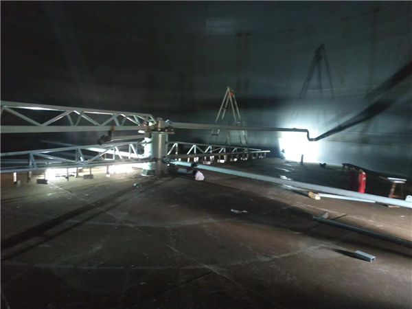 (3)配套罐底刮泥机由刮板在罐底作周向循环运行,将罐底部的油泥刮到吸泥口附近,由吸泥口吸出淤泥,排除罐外。